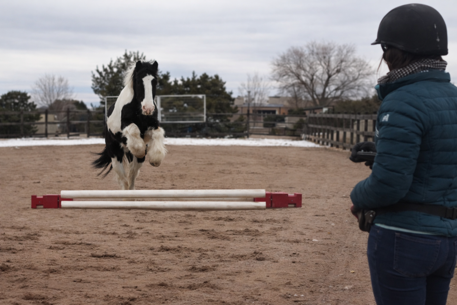Luca and I having silly fun, while practicing liberty jumping taught with Whole Horse Forward principles.